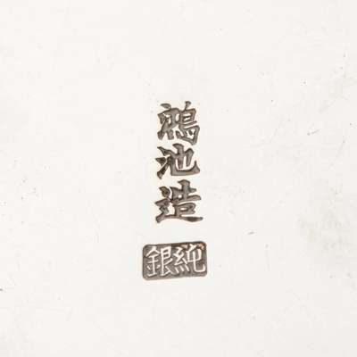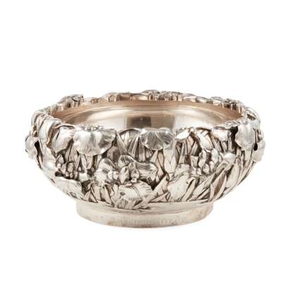 with character marks to base, the large hemi-spherical bowl with high relief Iris decoration