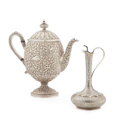unmarked, of ovoid form, heavily embossed and chased foliate decoration throughout, with hunting depictions to the body, the hinged domed lid with similar decoration and a knopped finial, all raised on a heavily decorated circular foot; together with an Indian rose-water or oil ewer, the neck of elongated slender form to a globular body, the hinged lid with applied serpent and tail extending to the handle, with all-over engraved and chased floral and foliate decoration