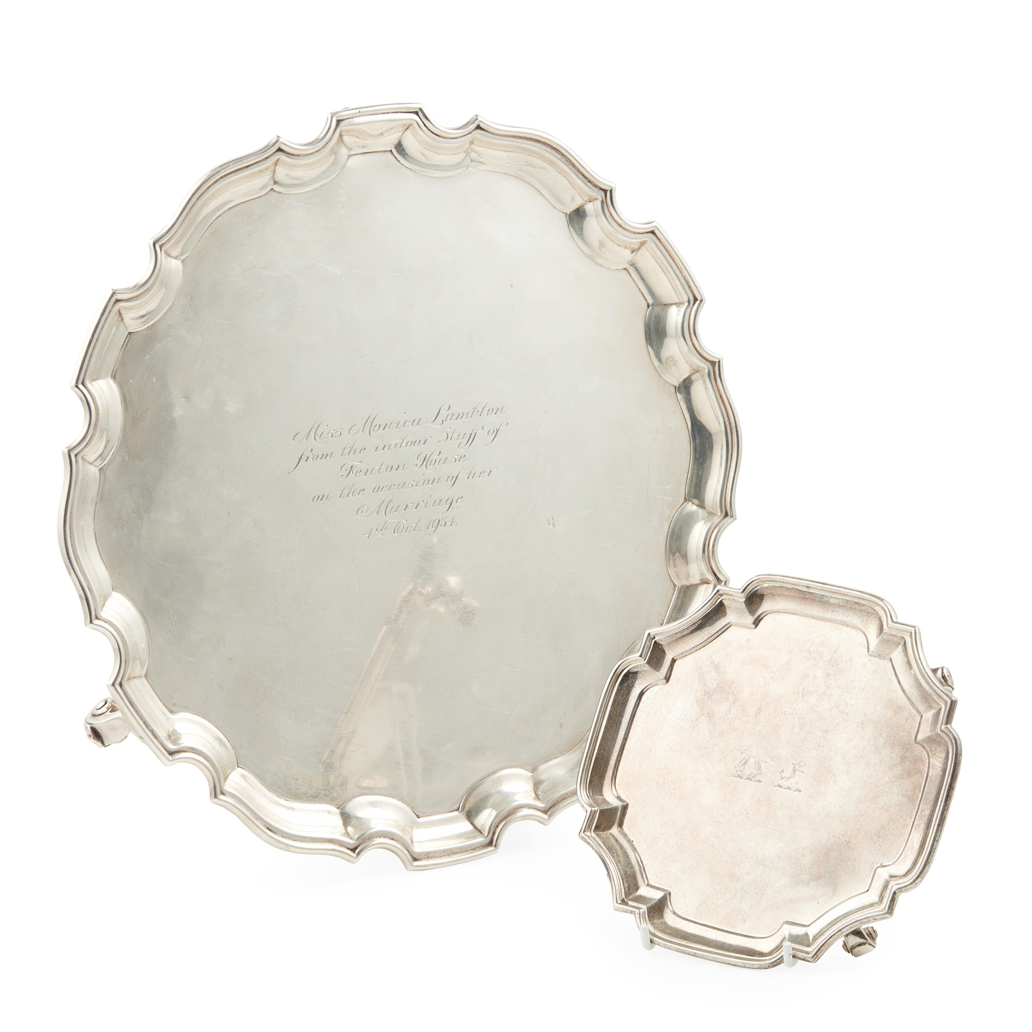 S Blanckensee & Sons Ltd, London 1933, with moulded edge, engraved inscription to centre, raised on three leaf clasped scroll feet; together with a small card tray, Heming & Co. London 1932, engraved double crest raised on four scroll feet