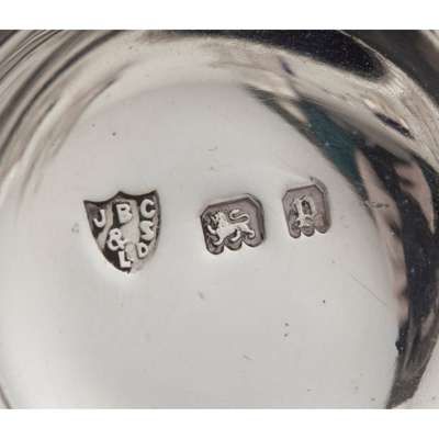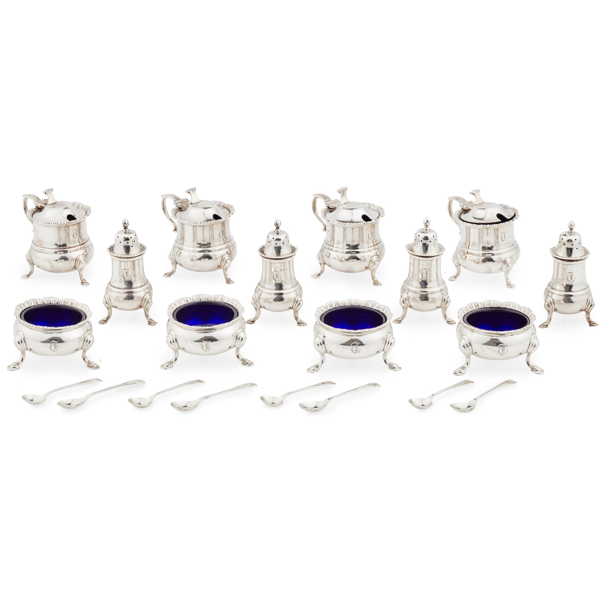 J B Chatterley & Sons Ltd, London 1930, comprising four of each, circular salts with gadrooned border, each raised on three hoof feet, mustard pots with hinged lids and salts, of traditional baluster caster form, all with spoons and liners, engraved initial to centre of each and presented in a fitted oak case