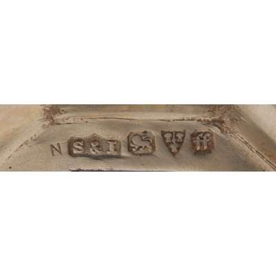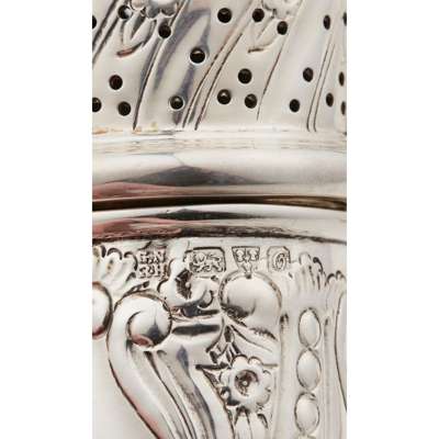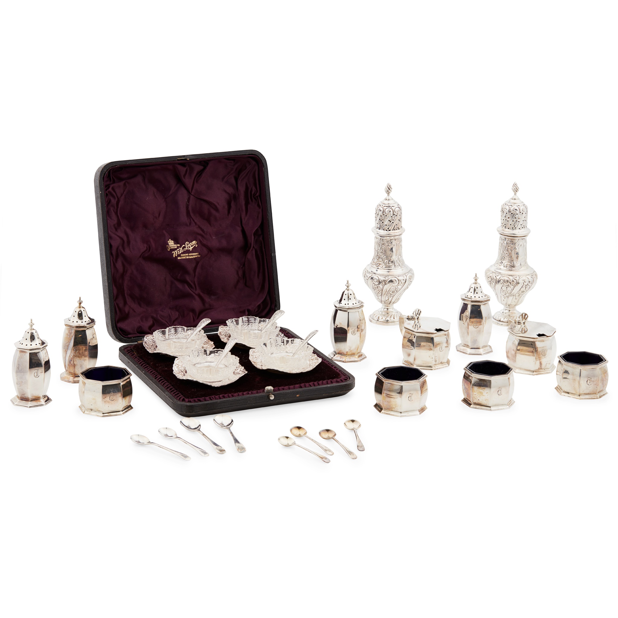 Chester 1924, comprising four open salts, two mustards, four peppers, each of octagonal form, engraved Gothic T to the body, with spoons; together with a cased set of matched casters, George Nathan & Ridley Hayes, Birmingham 1916 / Chester 1914, both of traditional form, all over embossed scroll detail, the pull-off lids with pierced detail and turned finials; together with a set of four plated salts with cut-glass liners