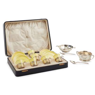 Mappin & Webb, Birmingham 1920, for six, the applied silver mounts with pierced body and gadrooned rim, the porcelain cans yellow ground; together with a cased quaich and spoon, Elkington and Sons Ltd., Birmingham 1937, the shallow bowl with engraved initials JRACT 1-11-38; and a cased porringer and spoon, Deakin & Francis Ltd, Birmingham 1936, engraved initials J.R.A.C.THOMPSON, retailed by Edward and Sons of Glasgow
