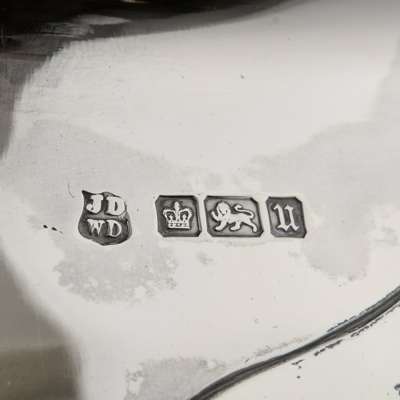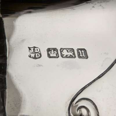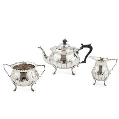 James Deakin & Sons, Sheffield 1912, comprising a teapot, twin handled sugar basin and a milk jug, each of circular form with moulded borders, the lower bodies each clasped with repoussé and engraved scroll decoration, the angular handles with an undulating design, each raised on four stepped hoof feet