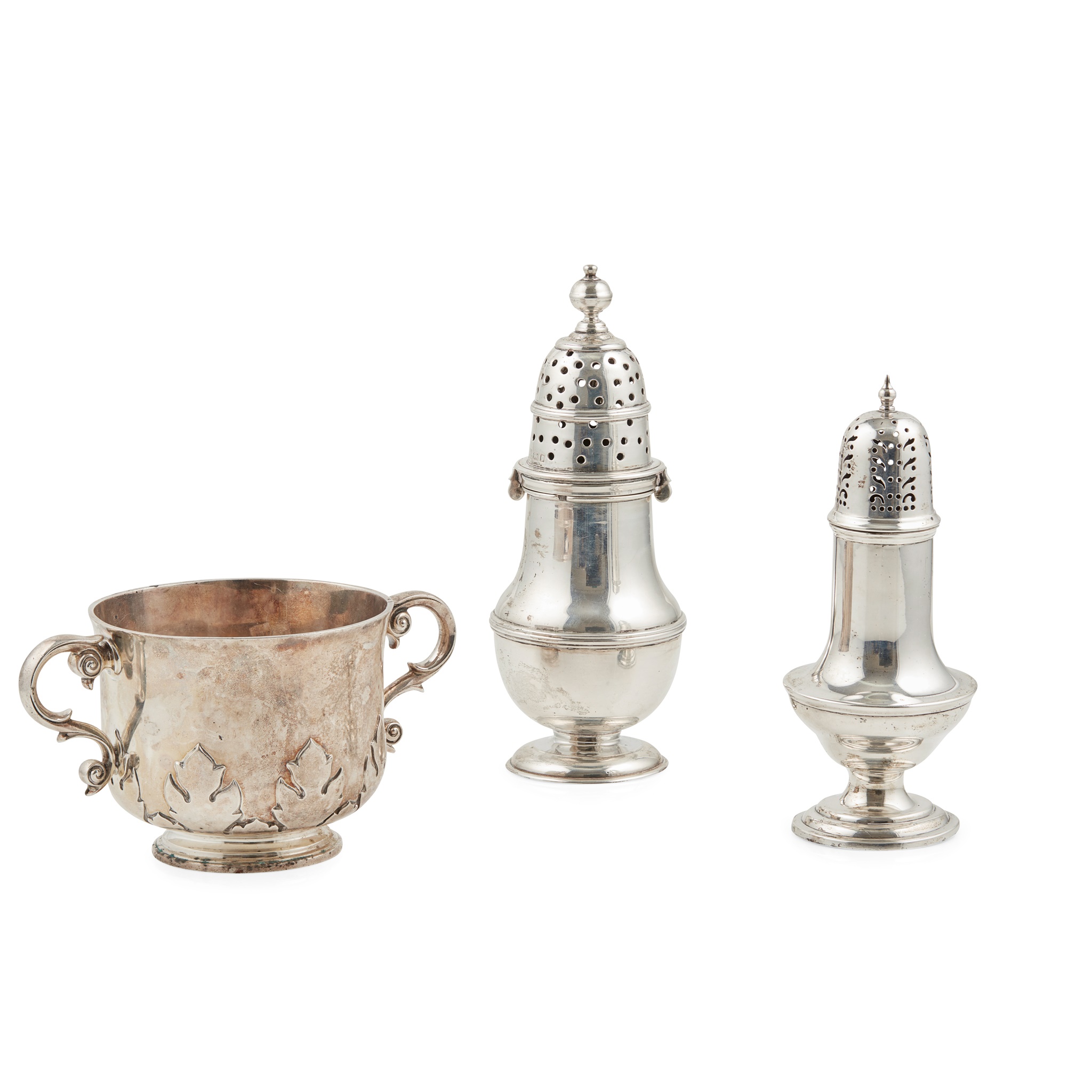 Henry Lambert, London 1905, in the Charles II style, the cylindrical body with applied cut card detail, collet foot and scroll handles, engraved to underside; together with a Queen Anne style caster and another smaller sugar caster