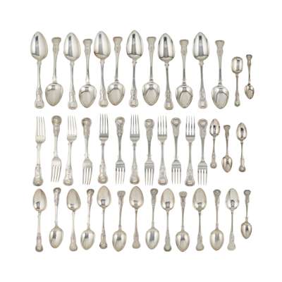 various makers and marks, all Edinburgh, comprising twelve table forks, twelve tablespoons, thirteen dessert spoons, and five teaspoons, initials engraved to terminals; together with a similar sugar spoon, London