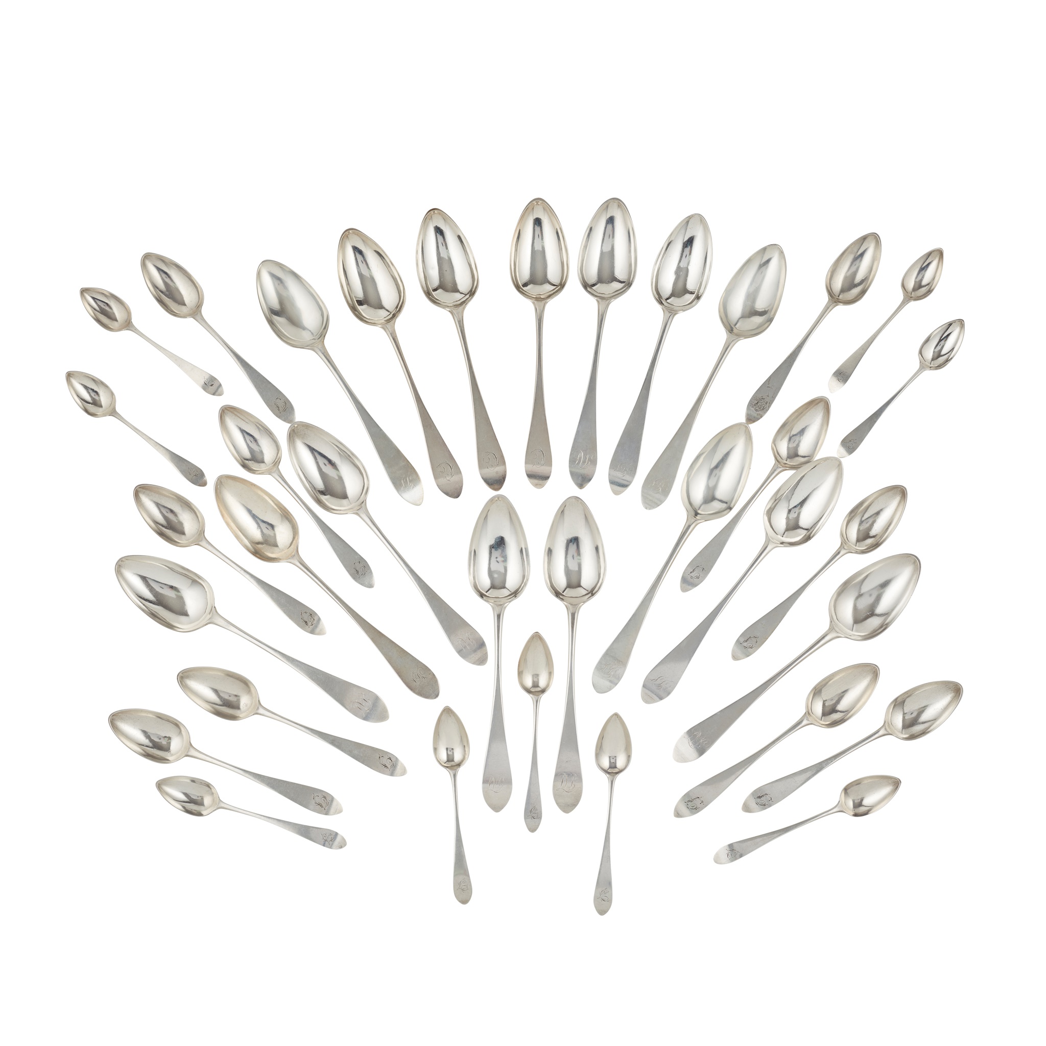 Graham & McLean, Edinburgh 1798, of Celtic Point pattern, initials engraved to terminal; together with a matched set of nine tablespoons, of Celtic Point pattern, various initials engraved to terminal; together with a set of ten dessert spoons, of Celtic Point pattern, initials engraved to terminal and a collection of similar teaspoons