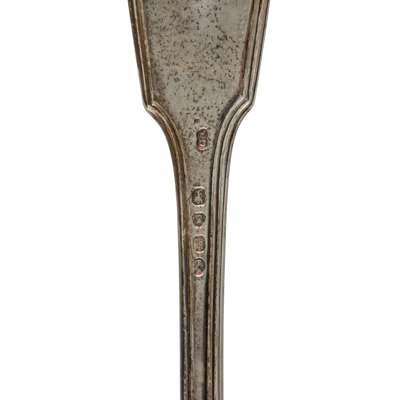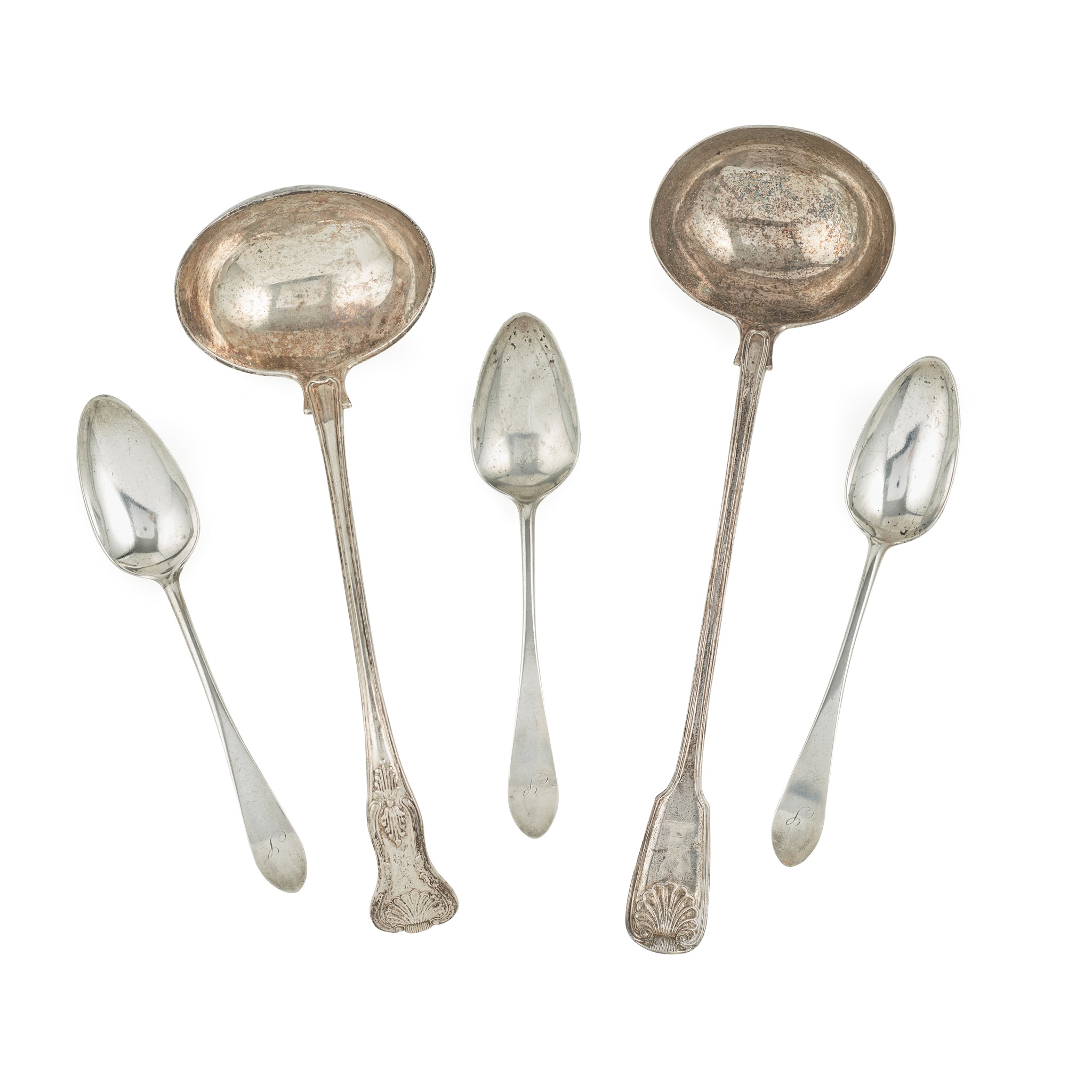 Ed. Livingstone marked EL, a pot of lilies, U, topped heart, of Celtic point pattern, italic J engraved to the terminal; together with a soup ladle, Chawner & Co, London 1845, Fiddle Thread and Shell, crest to the terminal and another London 1911 of King's pattern