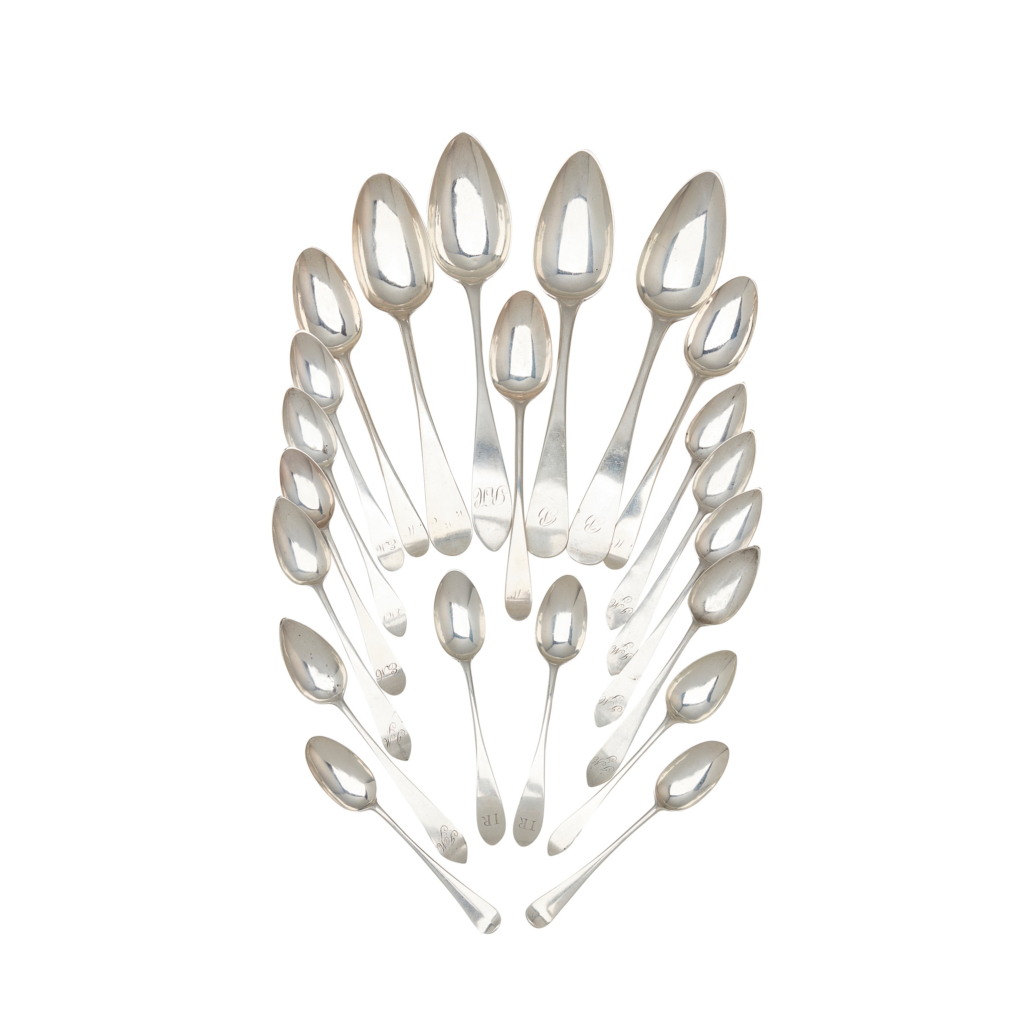 Thomas Davie, marked TD, anchor, oak tree, of Celtic point pattern, engraved initials to terminal; together with another two teaspoons, Edward Livingstone, Dundee, marked EL, *, D, topped heart, initials to terminal; a collection of teaspoons, four unassociated by William Byers, Aberdeen, two possibly John Leslie of Aberdeen; together with a pair of tablespoons Robert Keay, of Perth, marked RK, double headed eagle, RK, double headed eagle, of Old English pattern, italic B to terminal and another of Celtic point pattern, initials engraved to terminal; three dessert spoons, Robert Keay, Edinburgh 1789; and a tablespoon marked I*O four times, with initials to terminal