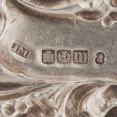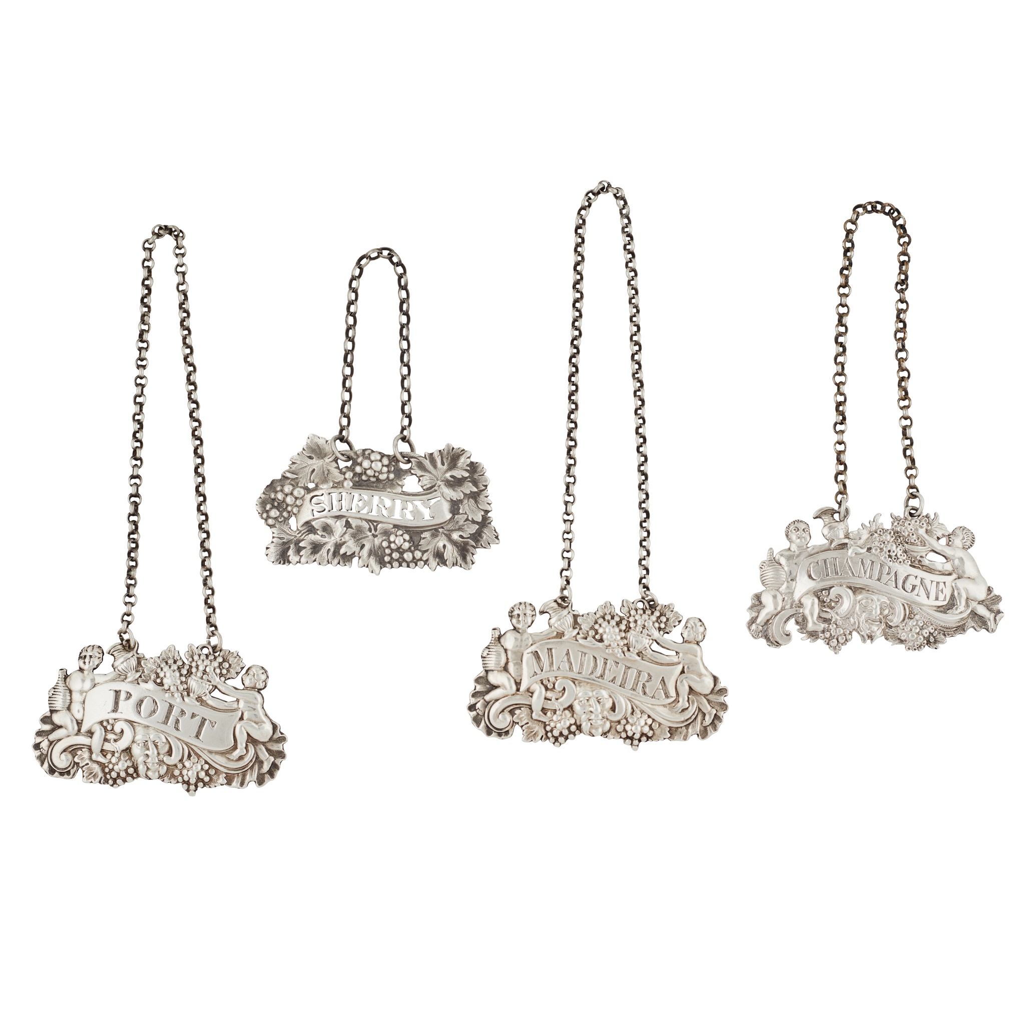 JM, Edinburgh 1818, each cast with a Bacchus mask and cherubic figures in vine border, engraved for MADEIRA and PORT; together with another of similar design, Sandilands Drinkwater, engraved for CHAMPAGNE and another, indistinctly marked, pierced for SHERRY in vine and repoussé grape border