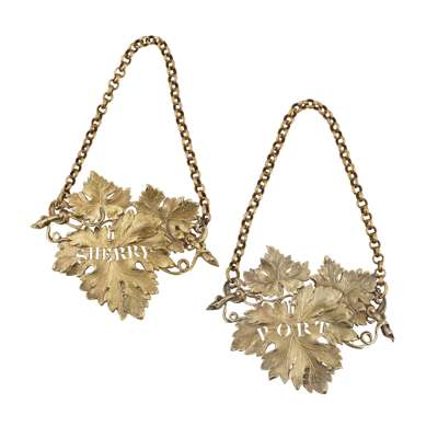 W.*., London 1835, modelled as a vine leaf, pierced for Sherry; together with another similar, Reilly and Storer, London 1813, pierced for Port, both with belcher link chains