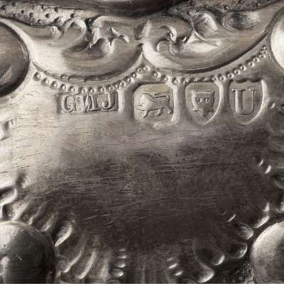 GWJ, London 1895, of oval form with upturned curled terminals, pierced scroll border with embossed detail to the body, raised on an oval foot; together with an eastern market oval bowl, unmarked, with stylised head terminals, ring handles, pierced border and a Middle eastern niello decorated twin handled sugar basin and cover