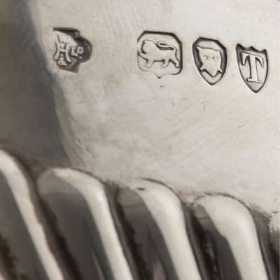 I.R., London 1817, of oval form, gadrooned border and raised on four ball feet; together with a matched twin handled sugar basin and milk jug, London 1893, of oval demi-fluted form; a modern comport Stower & Wragg Ltd, Sheffield 1947, with cast vine border and pierced flat with berry detail and a George III Irish jug with bright-cut engraved detail