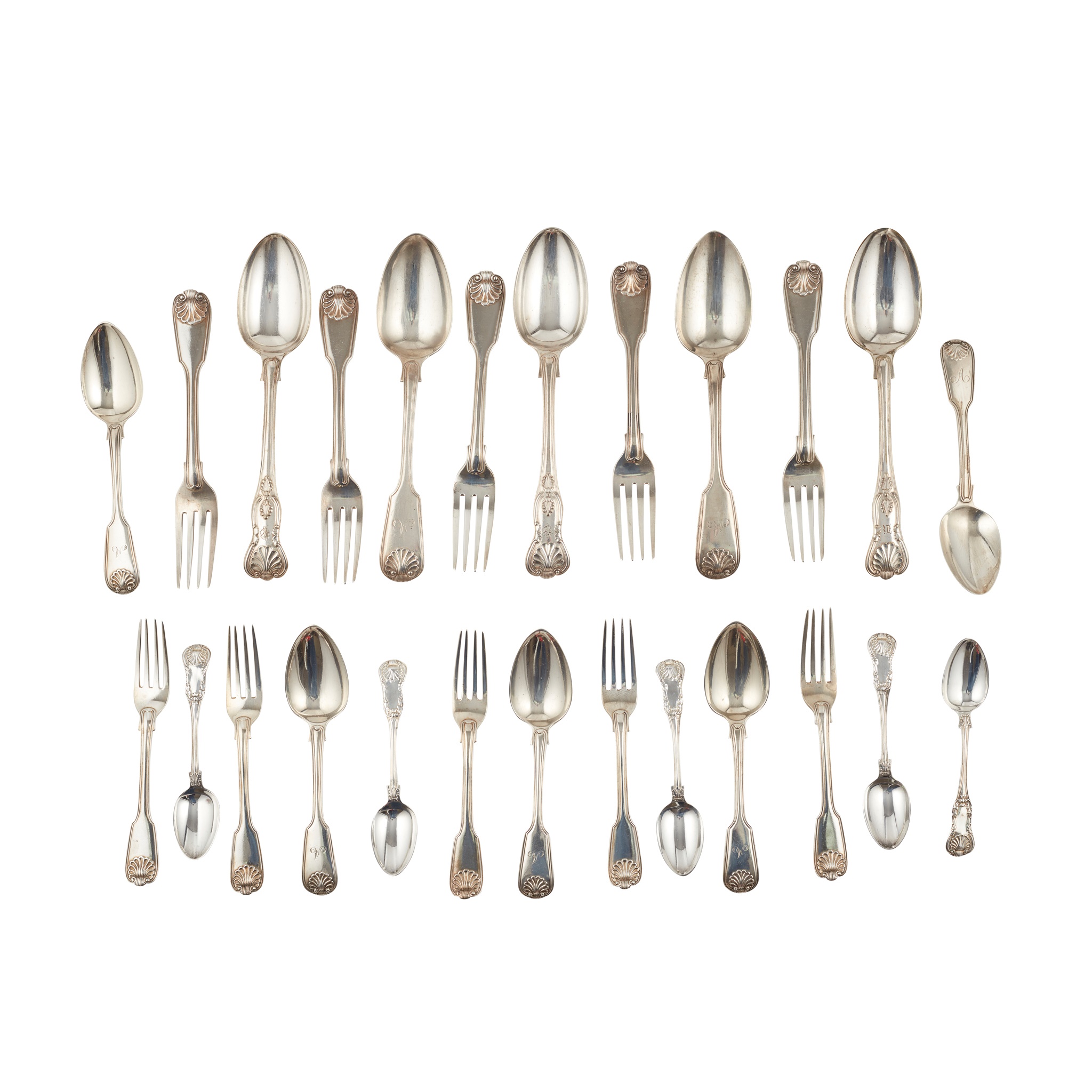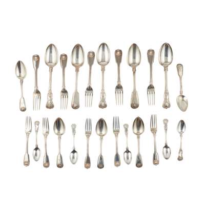 various dates and makers, predominantly double struck Fiddle Shell and Thread pattern, some single struck noted; together with a small amount of Old English and Queen's pattern flatware and four plated tablespoons