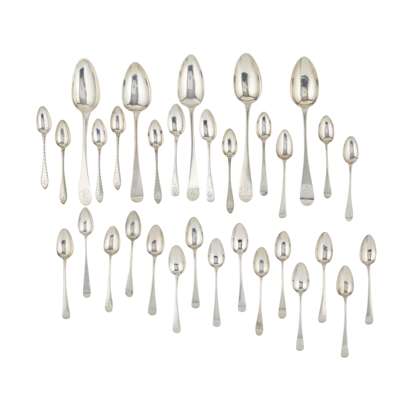 including a pair of tablespoons, Dorothy Langlands, Newcastle, of Old English pattern, engraved initials to terminal; together with another two Newcastle, various marks, and one tablespoon, George Turner, Exeter 1811; together with a collection of twenty-seven teaspoons, various marks and patterns