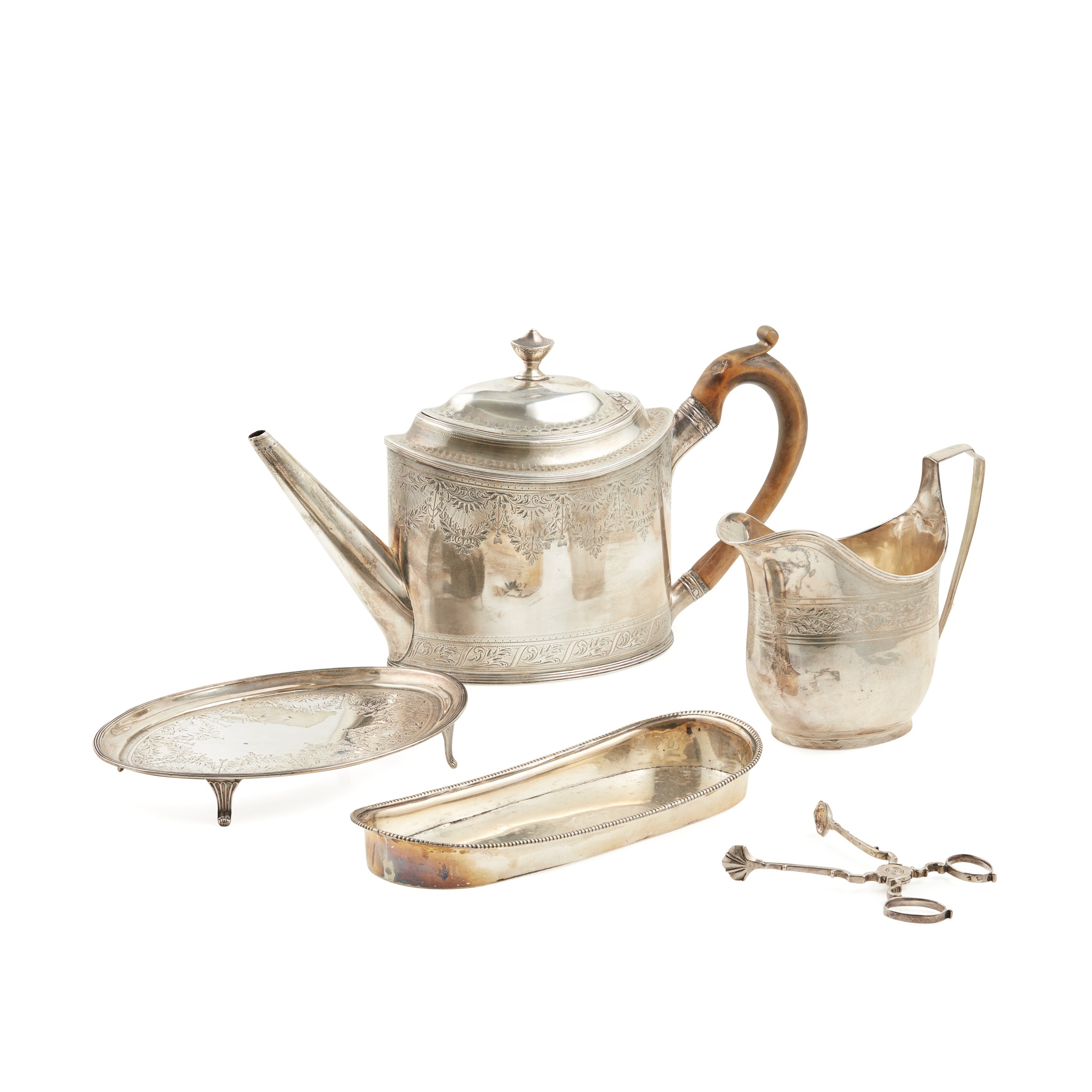 Peter and Anne Bateman, London 1780, of oval form, bright cut decoration; with a helmet shaped cream jug of similar period and decoration, unmarked; a pair George III sugar nips and a wick trimmer stand