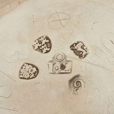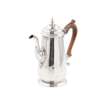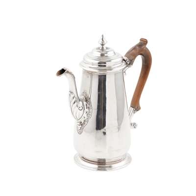 John Langlands I, Newcastle 1769, of slightly baluster form, leaf clasped scroll spout within a chased border, wooden S-scroll handle, the stepped domed hinged lid with knopped finial