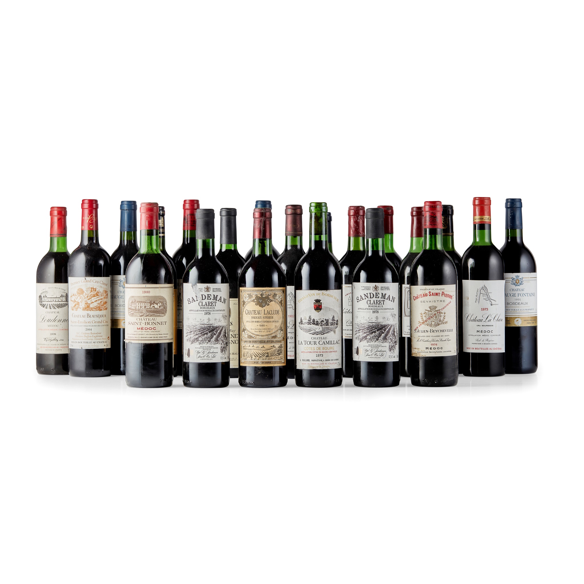 to include three bottles of Château Benauge Fontaine, 1905; a bottle of Château Fongaban 1990; a bottle of Château Grand Capron 1979; two bottles of Château La Clare, one 1973 Medoc and a 1982; a bottle of Château Beausejour Saint Emillion Grand Cru 2004; a bottle of Château La Tour Camillac 1973; a bottle of Château Laclude Bordeaux, 1980; a bottle of Château Londenne Medoc 1978; a bottle of Château La Riviere, Fronsac 1992; a bottle of Château St Julien-Beychevelle Medoc 1974: a bottle of Hawkes Bay Cabernet Sauvignon 1985; a bottle of Château d'Angludet 1998; and a bottle of Château Saint- Bonnet Medoc 1980; together with two bottles of Berry's Good Ordinary Claret; two bottles of Sandeman Claret 1978; and a bottle of The College Claret