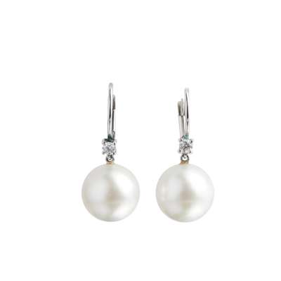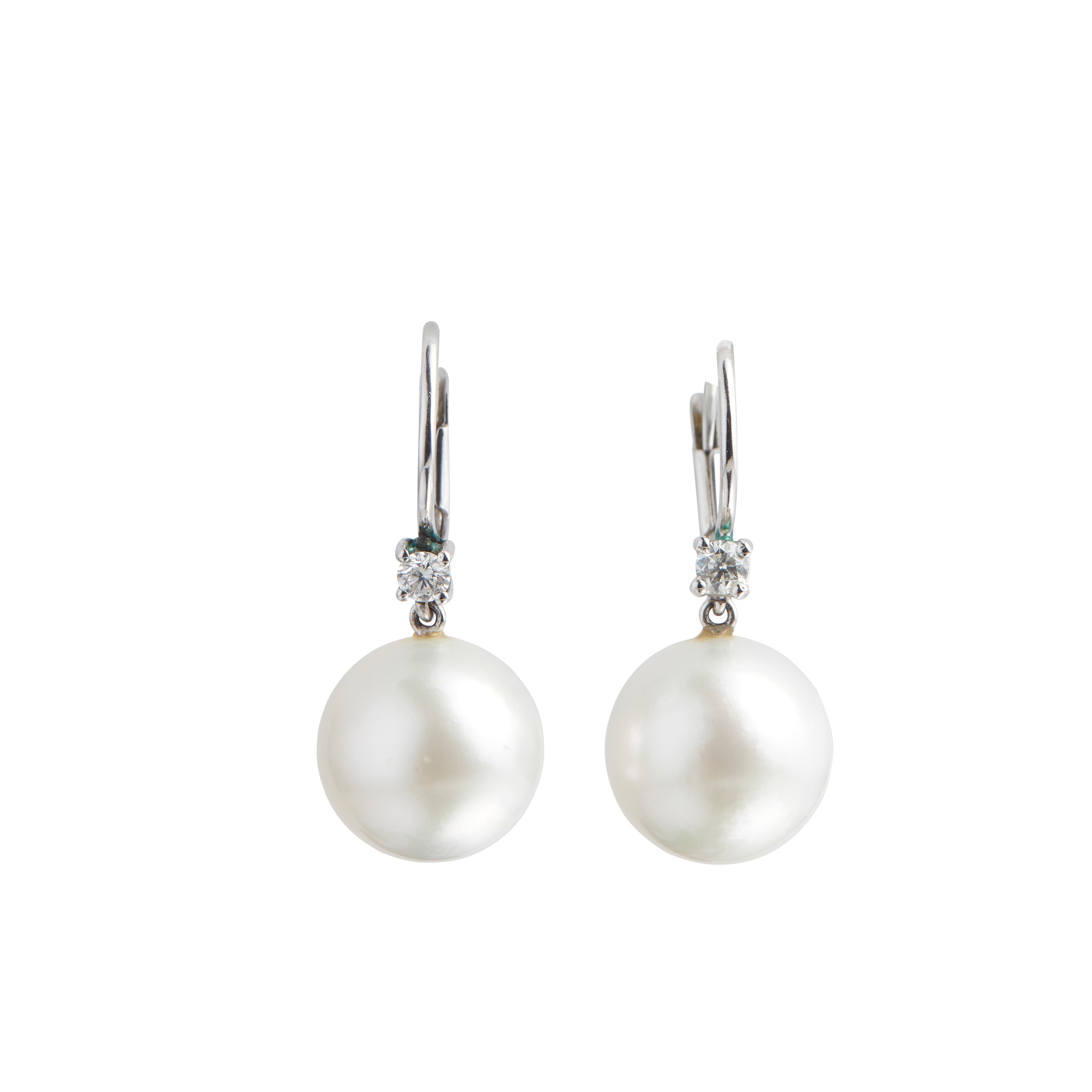 each set with a single round brilliant-cut diamond above a South Sea pearl, to hook and clip fittings, unmarked