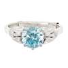 claw set with a round cut blue zircon, each shoulder set with three small eight cut diamonds, to a white metal shank stamped 18ct