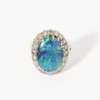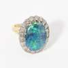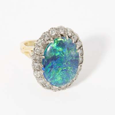 claw set with a large oval black opal triplet, in a single border of small round brilliant cut diamonds, to a plain yellow metal shank, stamped 18ct