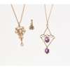 to include an Edwardian amethyst and seed pearl set pendant, to an 18ct gold trace link chain; an Edwardian aquamarine and seed pearl set pendant, to an 18ct gold belcher link chain; and a modern diamond and Tanzanite set pendant, stamped K18 (3)