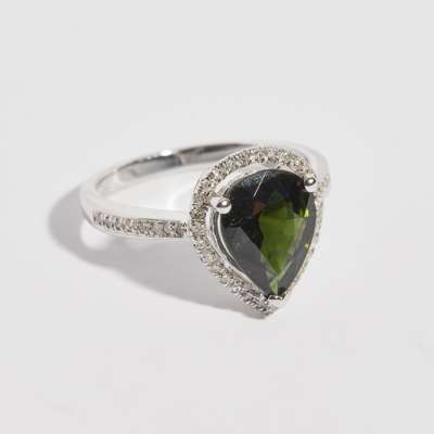 claw set with a pear shaped green tourmaline in a border of round brilliant cut diamonds, each shoulder similarly set with eight round brilliant diamonds, to a plain white metal shank G14K