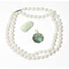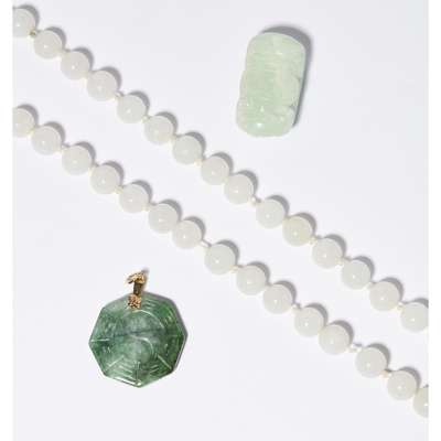 composed of a single strand of uniform white jade beads; together with a mottled green jade pendant with carved ying and yang detail; and a carved jade belt plaque (3)