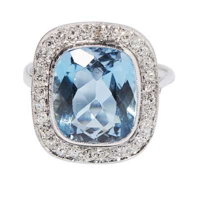 millegrain set with an oval cushion cut aquamarine, in a border of eight cut and rose cut diamonds, to a plain unmarked white metal shank