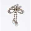 modelled as a bow, set throughout with small rose cut diamonds, suspending two similarly set drops each terminating in an off-oval shaped pearl, unmarked