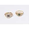the first with a central blue enamel panel and small rose cut diamond detail, in a border of half pearls, engraved detail throughout the shank; the second with a green paste centre in a border of half pearls, engraved detail to shoulders (2)
