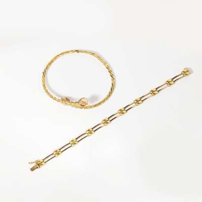 of twisted design, the terminals set with carved coral rose buds, unmarked; together with a modern rectangular fancy link bracelet, stamped 750 (2)