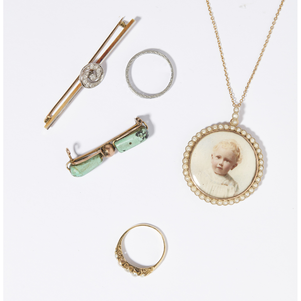 to include a late Victorian pearl set double sided pendant, stamped 9ct; a diamond set bar brooch and another turquoise set brooch; a pearl and diamond set ring, stamped 18ct and a diamond set eternity ring, unmarked (5)
