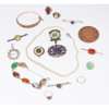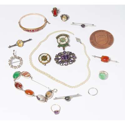 to include an agate set bracelet, an amethyst set ring, stamped 9ct; a Victorian 9ct gold red paste set bangle, various bar brooches, gem set rings, medals etc (qty)