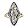 of navette shape, millegrain set with a central old round cut diamond, flanked by two smaller round cut diamonds with small rose and eight cut diamond detail throughout, in a border of channel set square cut sapphires, to a plain yellow metal shank, indistinctly marked