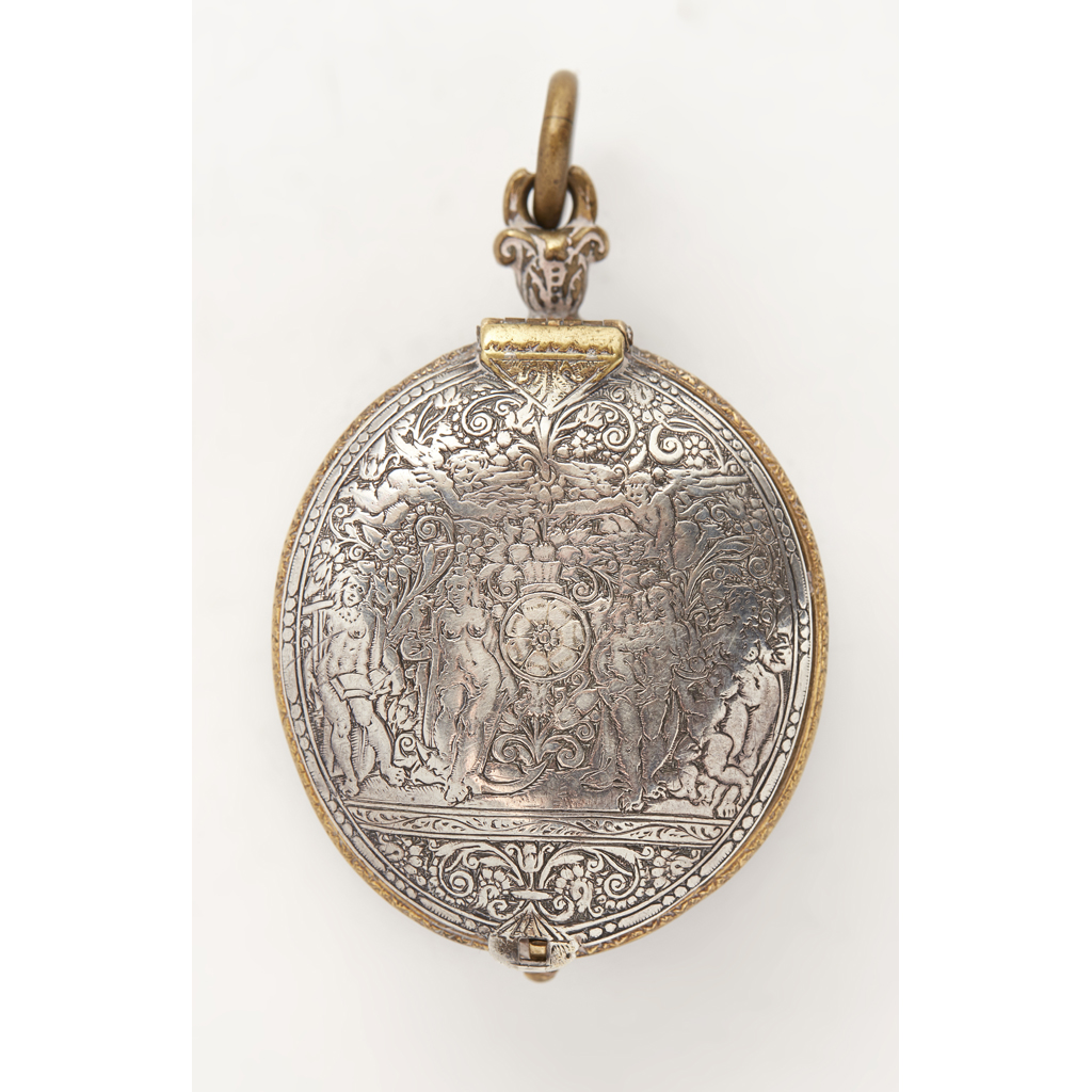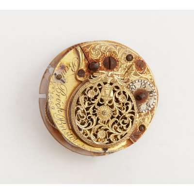 apparently unmarked to the oval case, the upper and lower white metal panels, finely engraved with figures, putto, floral sprays and architectural features etc, the sides well pierced with scrolling foliage, enclosing a watch of conforming shape, silver chapter ring, engraved brass ground, hands lacking, the later movement inscribed Ben Brock Bristol and numbered 1469