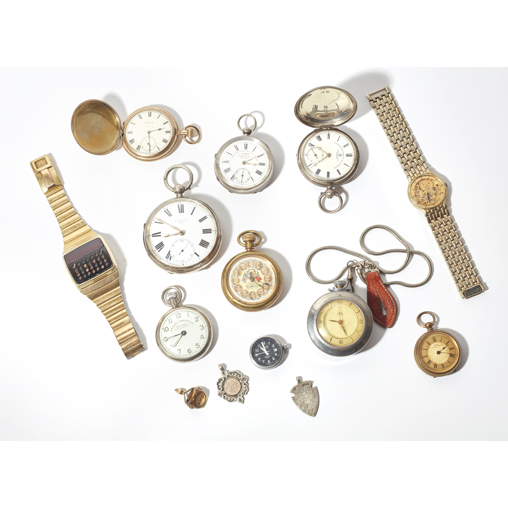 to include Hewlett Packard LED wrist watch, Model 1; a large silver cased pocket watch, Charles Frodsham, inscribed dial and movement, lever movement (Case diameter 65mm); two other silver cased pocket watches; five other cased pocket watches; a fob medal; a small quartz swivel seal (qty)