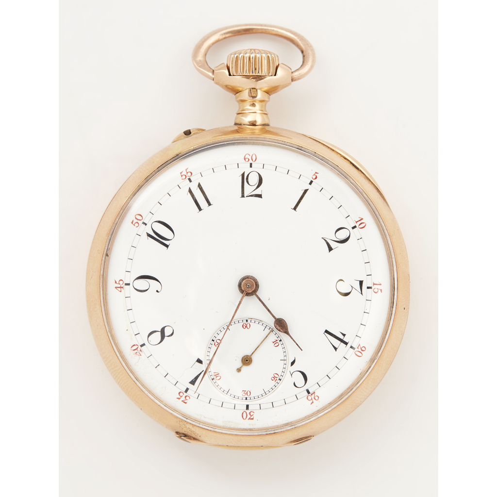 open faced keyless wind, white dial with Arabic numerals, subsidiary seconds dial, plain case, lever movement
