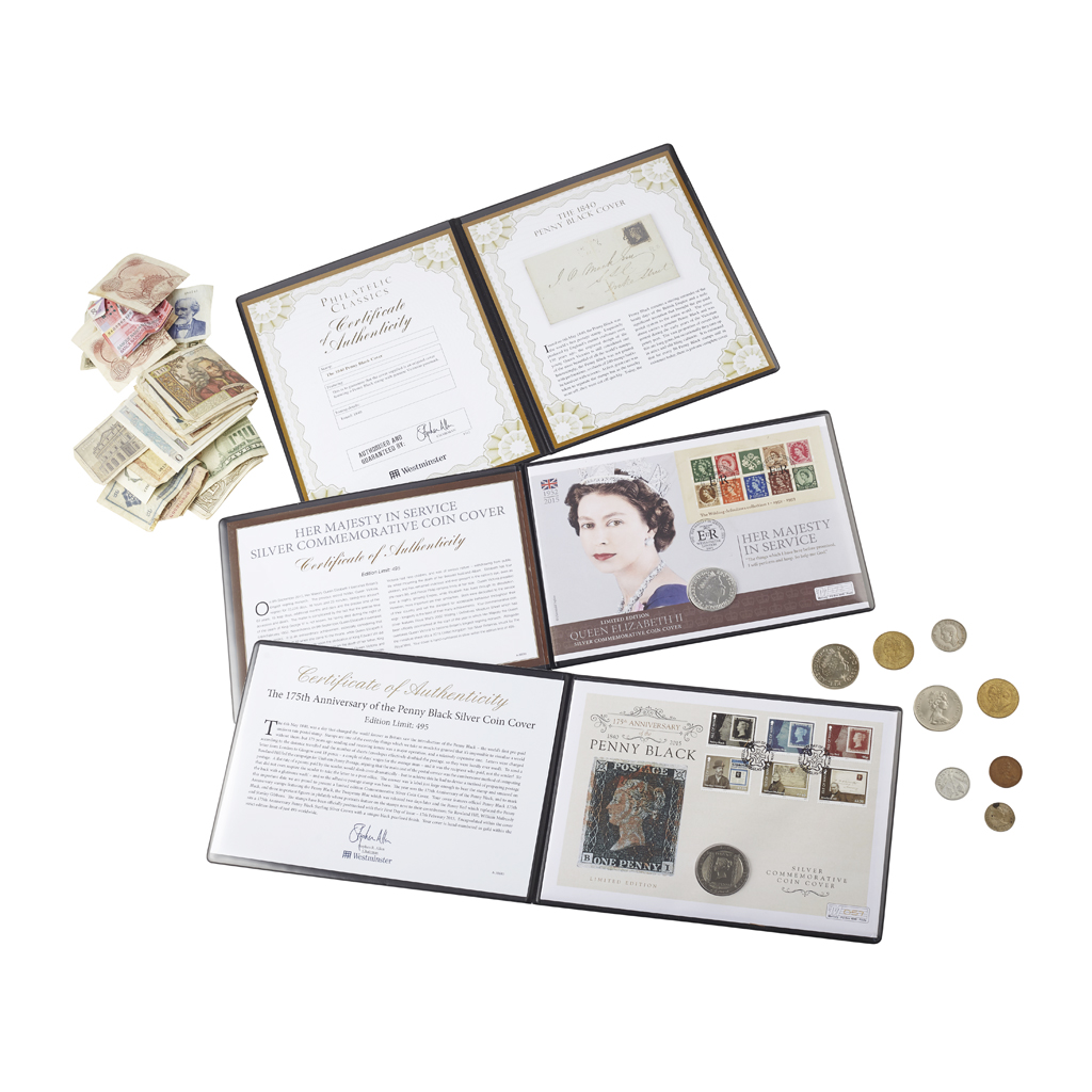 to include Sapphire Jubilee £10 coin, cased, silver, Battle of Britain four coin set 1915, Guernsey silver 5oz proof coin 2015 £10, Royal birth HRH George 2013 x 2, 2017 proof sovereign, cased with COA, Jersey 2015, £1 proof, 2014 birth coin proof, 2014 $20 silver proof coin, miscellaneous low denomination coins, banknotes etc. 2015, £5 silver proof coin in FDC and album, 2015, crown on FDC for penny Black and album, an 1840 1d penny black cover, in album (qty)