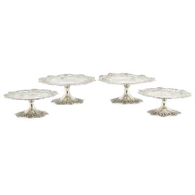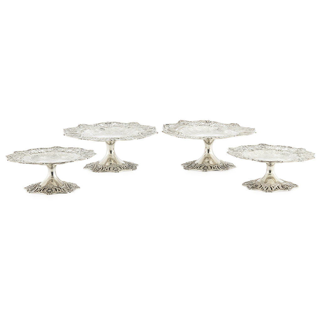 marked J.E. Caldwell, STERLING, of shaped circular form, pierced border, engraved foliate detail to dish, raised on a trumpet stand, together with a similar smaller pair (4)