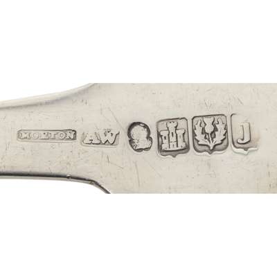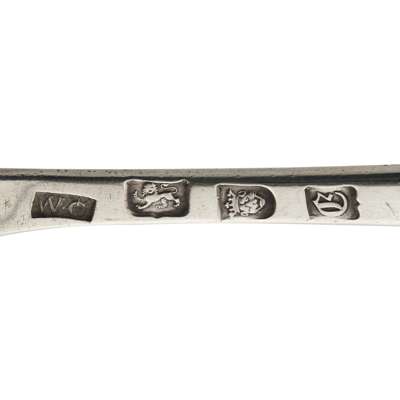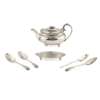 William Cripps, London 1760, small marrow scoop to handle and simple stem section above the bowl with engraved italic initials; together with a teapot stand, John Emes, London 1802, of oval form, bright cut engraving, raised on four bracket feet, three tablespoons, A.W. Edinburgh of Fiddle and Shell pattern and a teapot (marks very worn), of oval form, cast floral border, raised on four ball feet (6)