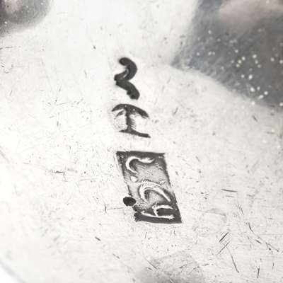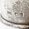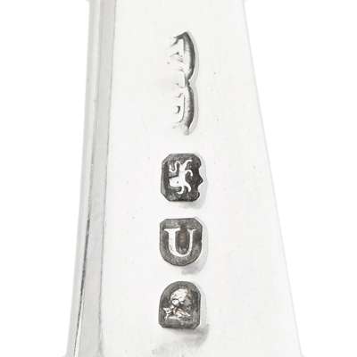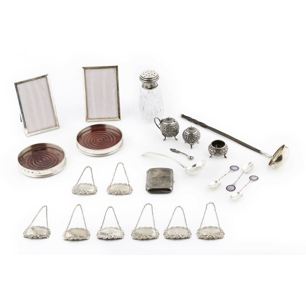 to include; a group of eight stamped wine labels, Francis Howard Ltd, Sheffield various dates; a Georgian toddy ladle; a knopped handled punch ladle; two modern silver frames, A. Edward Jones Ltd, Birmingham; a pair of wine holders, Birmingham; together with a collection of teaspoons, a cigarette case, a cut glass and silver mounted caster, and an Indian cruet set (qty)