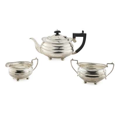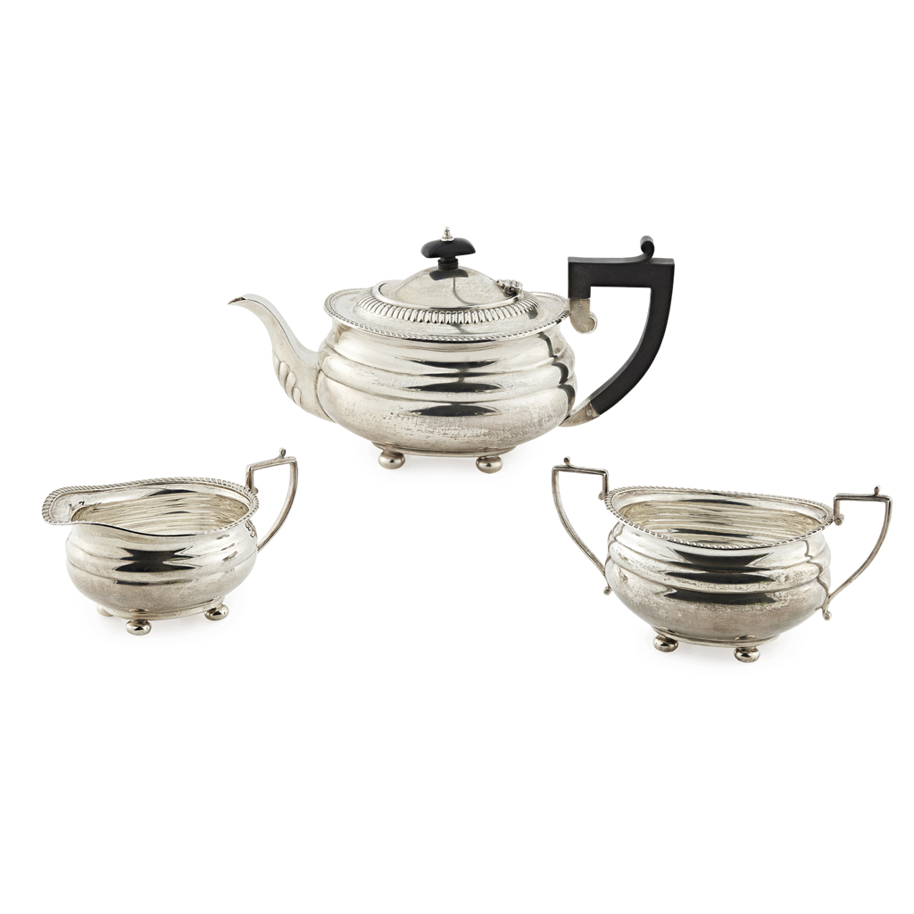 Elkington & Co Ltd, Birmingham 1939, comprising teapot, twin handled sugar bowl and milk jug, all of oval form, ribbed body, gadroon border, angular handles, all raised on four ball feet
