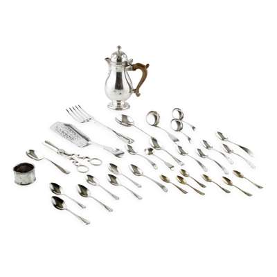 the water pot Wilson and Sharp (retailer) London 1936, of plain baluster form, cut card work to the domed hinged cover, plain body, together with cased items - a single spoon, six parcel gilt coffee spoons, six tea spoons; a William IV fiddle pattern fish slice, engraved crest and initial, reproduction maidenhead spoon, various other lesser silver and plate (qty)