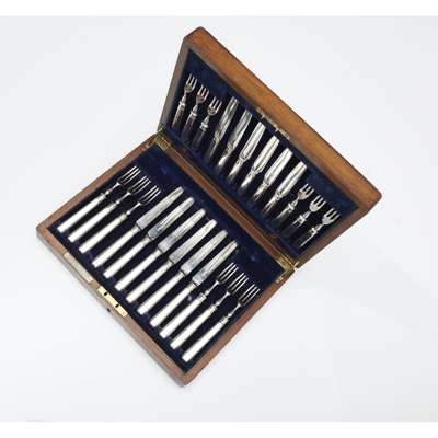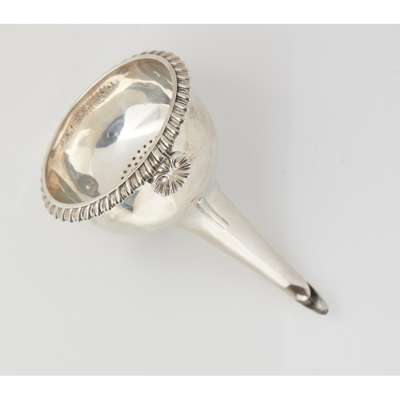 James Dixon & Sons Ltd, Sheffield 1928, all of Hanoverian pattern, comprising twelve table forks, eleven desert forks, six table spoons, twelve soup spoons, ten dessert spoons, two toddy ladles and one associated teaspoon; together with a George IV wine funnel with shell motif and a cased plated set of flatware (qty)