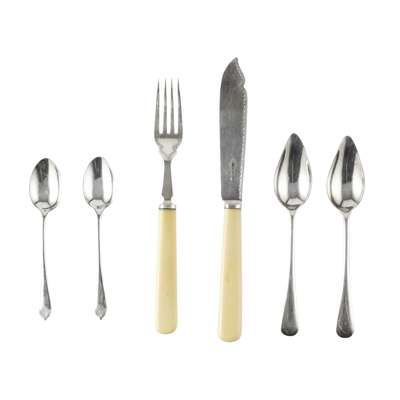 Sheffield 1920, comprising twelve knives and forks with engraved detail and plain ivory handles, in fitted case; together with a cased set of six grapefruit spoons and a part set of teaspoons and tongs (3)