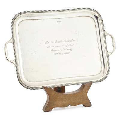 J*ltd., Birmingham 1929, of rounded rectangular form with gadrooned rim, twin loop handles, presentation engraving to centre