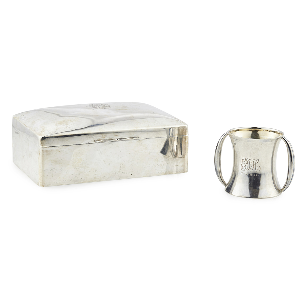 Elkington and Co., Birmingham 1928, of rectangular form, domed hinged cover, engraved monogram and dated, cedar lined interior; with a two handle mug, HA Sheffield 1920s, concave sides, gilt interior, engraved conjoined initials (2)