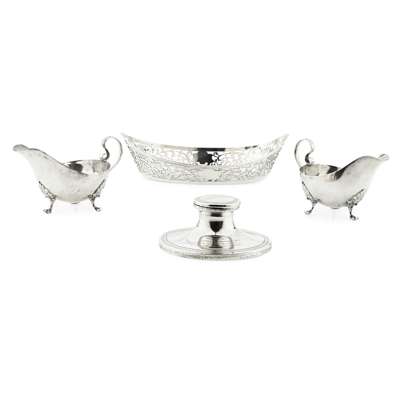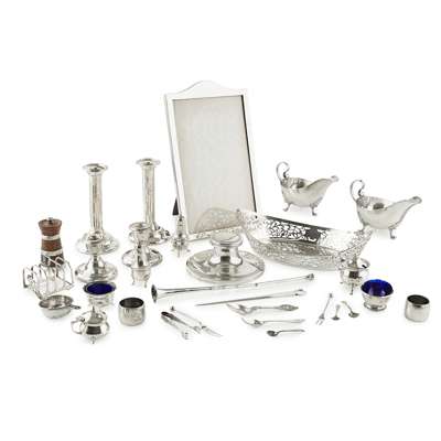 to include; a capstan inkwell, Birmingham, 1925, pair of plated sauce boats; a silver bread basket, GH Sheffield 1900; a pair of table candlesticks, a pair of dwarf table candlesticks, meat skewer, various condiments, small toast rack, napkin rings, photograph frame, etc (qty)