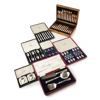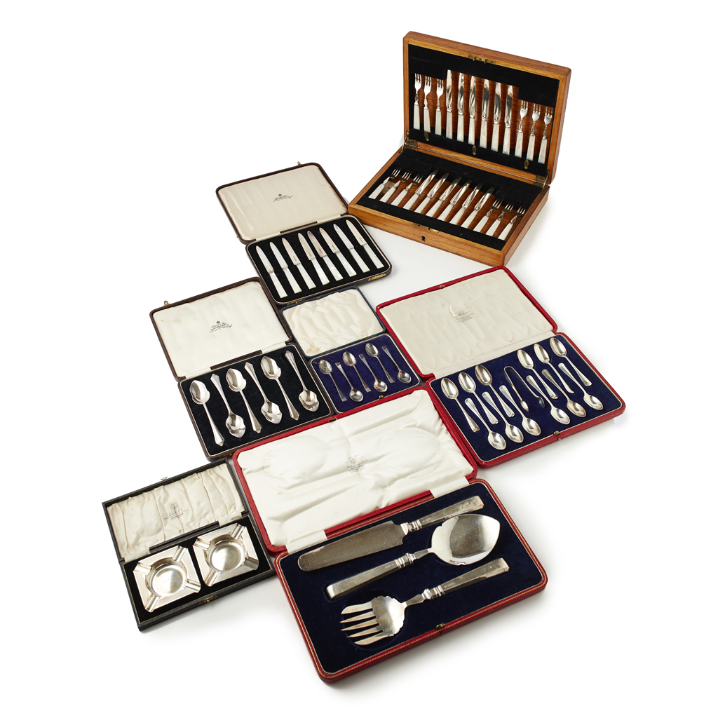to include, a cased set of servers, a cased set of grapefruit knives, a cased set of six mother of pearl handled fruit knives, and another set of twelve with forks, a pair of ashtrays, a cased set of twelve teaspoons and a pair of tongs; a cased set of six teaspoons (qty)