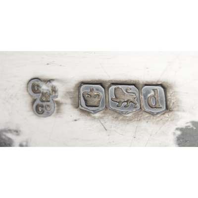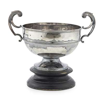 Hutton and Co. Sheffield 1922, of plain round form, moulded girdle, flying scrolling handles, and on socle base